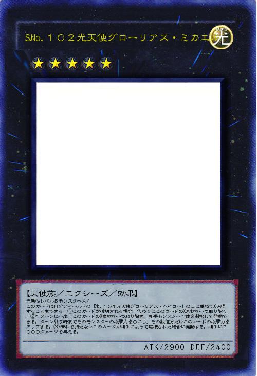 「グローリアス・ヘイローのSNo.版です。破壊される際に取り除くエクシーズ素材は一つでモンスター効果を無効にできなくなった代わりに自己強化することができる形にしました。エクシーズ素材を持ってない状態で相手に破壊されると3000のバーンを与えます。」(2019-04-17 23:10)