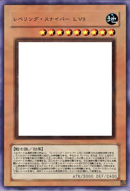 | このカードは通常召喚できない。「レベリング・スナイパー LV5」の効果でのみ特殊召喚できる。①このカードが特殊召喚に成功した時発動できる。手札から「レベル」または「LV」と名のつくカードを任意の数だけ選択してデッキに戻す。その後デッキに戻したカードの枚数までフィールドのカードを選択して破壊する。③このカードは直接攻撃できる。その直接攻撃で相手に与える戦闘ダメージは半分になる。④1ターンに1度このカードのレベルを4下げて発動できる。フィールドに表側表示で存在するエクストラデッキから特殊召喚されたモンスター1体を選択して除外する。⑤このカードが戦闘または相手の効果によって破壊された時発動できる。このカードのレベルより低いレベルを持つ、相手フィールドの表側表示モンスター1体を選択して破壊する。 | |||