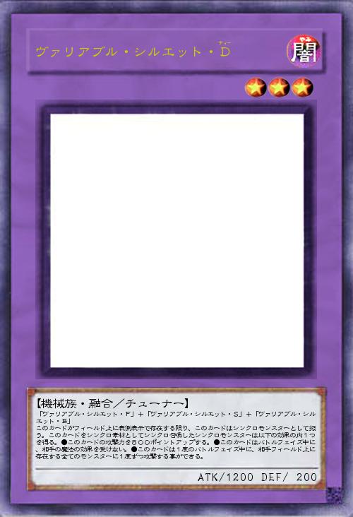 「ヴァリアブル・シルエット・F」+「ヴァリアブル・シルエット・S」+「ヴァリアブル・シルエット・B」 このカードがフィールド上に表側表示で存在する限り、このカードはシンクロモンスターとして扱う。このカードをシンクロ素材としてシンクロ召喚したシンクロモンスターは以下の効果の内1つを得る。●このカードの攻撃力を800ポイントアップする。●このカードはバトルフェイズ中に、相手の魔法の効果を受けない。●このカードは1度のバトルフェイズ中に、相手フィールド上に存在する全てのモンスターに1度ずつ攻撃する事ができる。 |