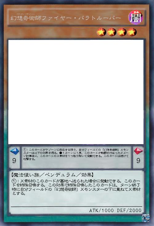 | ①:X素材のこのカードが墓地へ送られた場合に発動できる。このカードを特殊召喚する。この効果で特殊召喚したこのカードは、ターン終了時に自分フィールドの「幻想奇術師」Xモンスターの下に重ねてX素材とする。 | |||