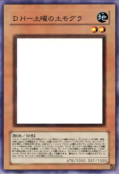 | このカード名の①と②の効果は1ターンに1度までしか発動できない。①このカードが召喚・特殊召喚に成功した時墓地から「DHー土曜の土モグラ」以外のレベル4以下の「DH」モンスター1体を選択して特殊召喚できる。②自分フィールドに「DHー土曜の土モグラ」以外の「DH」モンスターが存在する時、このカードとこのカード以外の「DH」モンスター1体を墓地へ送って発動できる。デッキから地属性・レベル8の「DH」モンスター1体を選択して特殊召喚する。この効果で特殊召喚したモンスターはこのターン攻撃できない。③このカードが破壊された時自分フィールドの「DH」モンスター1体を手札に戻して発動できる。墓地から「DHー土曜の土モグラ」以外の「DH」モンスター1体を選択して手札に加える。 | |||