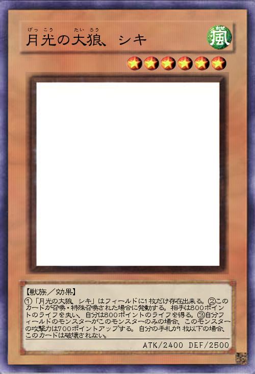 | ①「月光の大狼、シキ」はフィールドに1枚だけ存在出来る。②このカードが召喚・特殊召喚された場合に発動する。相手は800ポイントのライフを失い、自分は800ポイントのライフを得る。③自分フィールドのモンスターがこのモンスターのみの場合、このモンスターの攻撃力は700ポイントアップする。自分の手札が1枚以下の場合、このカードは破壊されない。 | |||
