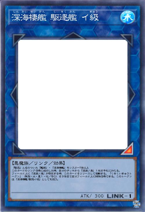 | 「駆逐」と名のついた「艦娘」・「深海棲艦」モンスター1体以上 このカードのリンク召喚に成功した時、自分のデッキから「深淵ノ海」1枚を手札に加える。 フィールド上に「深淵ノ海」が存在する時、このカードをリリースして発動する。「くちくいきゅうトークン」(魚族・水・星1・攻/守0)を3体まで自分フィールド上に特殊召喚できる。このトークンは「深海棲艦 駆逐イ級」としても扱う。 | |||