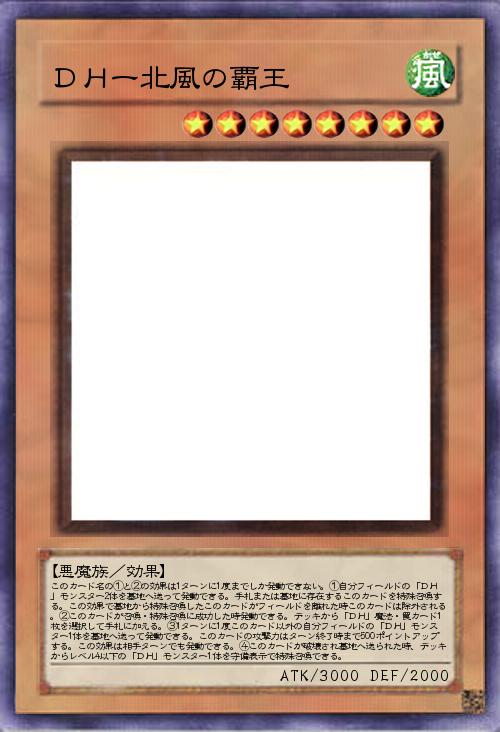 | このカード名の①と②の効果は1ターンに1度までしか発動できない。①自分フィールドの「DH」モンスター2体を墓地へ送って発動できる。手札または墓地に存在するこのカードを特殊召喚する。この効果で墓地から特殊召喚したこのカードがフィールドを離れた時このカードは除外される。②このカードが召喚・特殊召喚に成功した時発動できる。デッキから「DH」魔法・罠カード1枚を選択して手札に加える。③1ターンに1度このカード以外の自分フィールドの「DH」モンスター1体を墓地へ送って発動できる。このカードの攻撃力はターン終了時まで500ポイントアップする。この効果は相手ターンでも発動できる。④このカードが破壊され墓地へ送られた時、デッキからレベル4以下の「DH」モンスター1体を守備表示で特殊召喚できる。 | |||
