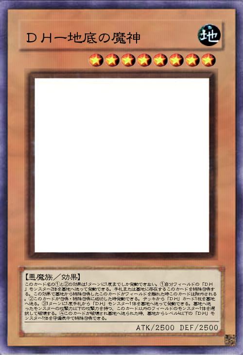 | このカード名の①と②の効果は1ターンに1度までしか発動できない。①自分フィールドの「DH」モンスター2体を墓地へ送って発動できる。手札または墓地に存在するこのカードを特殊召喚する。この効果で墓地から特殊召喚したこのカードがフィールドを離れた時このカードは除外される。②このカードが召喚・特殊召喚に成功した時発動できる。デッキから「DH」カード1枚を墓地へ送る。③1ターンに1度手札から「DH」モンスター1体を墓地へ送って発動できる。墓地へ送ったモンスターの攻撃力以下の攻撃力を持つ、このカード以外のフィールドのモンスター1体を選択して破壊する。④このカードが破壊され墓地へ送られた時、墓地からレベル4以下の「DH」モンスター1体を守備表示で特殊召喚できる。 | |||