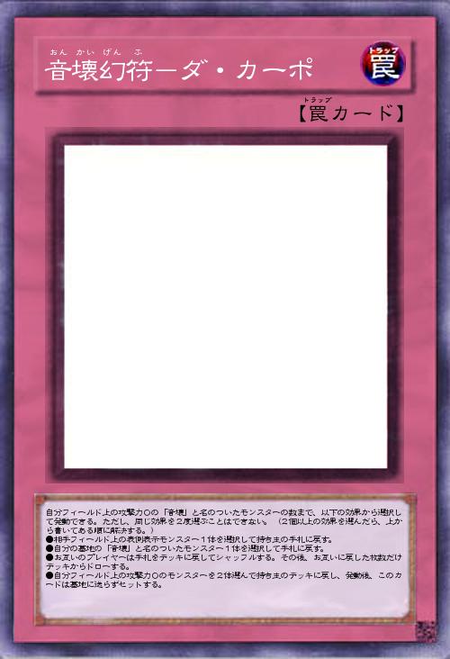 「優秀なトラップ。場にいる攻撃力0の音壊の数だけ効果が増えます。効果はすべて「戻す」ということに関連していて(場から手札に戻す、墓地から手札に戻す、手札からデッキに戻す、場からデッキに戻す&セット状態に戻す)、「ダ・カーポ」の符号の意味を意識しています(※)。