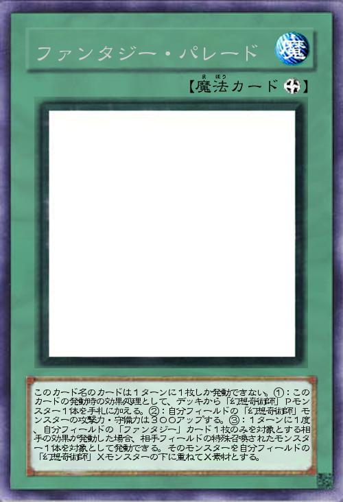 | このカード名のカードは1ターンに1枚しか発動できない。①:このカードの発動時の効果処理として、デッキから「幻想奇術師」Pモンスター1体を手札に加える。②:自分フィールドの「幻想奇術師」モンスターの攻撃力・守備力は300アップする。③:1ターンに1度、自分フィールドの「ファンタジー」カード1枚のみを対象とする相手の効果が発動した場合、相手フィールドの特殊召喚されたモンスター1体を対象として発動できる。そのモンスターを自分フィールドの「幻想奇術師」Xモンスターの下に重ねてX素材とする。 | |||