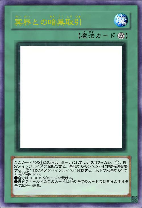 | このカード名の①の効果は1ターンに1度しか使用できない。①:自分メインフェイズに発動できる。墓地からモンスター1体を特殊召喚する。②:自分スタンバイフェイズに発動する。以下の効果から1つを選び適応する。 ●自分は3000のダメージを受ける。 ●自分フィールドのこのカード以外の全てのカード及び自分の手札を全て墓地へ送る。 | |||