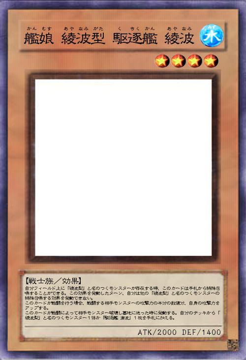 | 自分フィールド上に「綾波型」と名のつくモンスターが存在する時、このカードは手札から特殊召喚することができる。この効果を発動したターン、自分は他の「綾波型」と名のつくモンスターの特殊召喚する効果を発動できない。 このカードが戦闘を行う場合、戦闘する相手モンスターの攻撃力の半分の数値分、自身の攻撃力をアップする。 このカードが戦闘によって相手モンスター破壊し墓地に送った時に発動する。自分のデッキから「綾波型」と名のつくモンスター1体か「駆逐艦 浦波」1枚を手札に加える。 | |||
