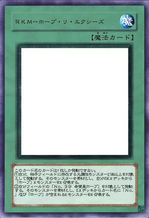 | このカード名のカードは1枚しか発動できない。 ①自分、相手フィールドに存在する光属性モンスター2体以上を対象として発動する。そのモンスターを素材とし、自分のEXデッキから「ホープ」XモンスターをX召喚する。 ②自分フィールドの「No.39 希望皇ホープ」を対象として発動する。そのモンスターを素材とし、EXデッキからカード名に「No.」及び「ホープ」が含まれるXモンスターをX召喚する。 | |||