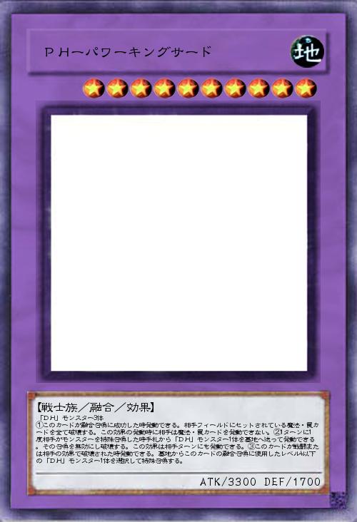 | 「DH」モンスター3体 ①このカードが融合召喚に成功した時発動できる。相手フィールドにセットされている魔法・罠カードを全て破壊する。この効果の発動時に相手は魔法・罠カードを発動できない。②1ターンに1度相手がモンスターを特殊召喚した時手札から「DH」モンスター1体を墓地へ送って発動できる。その召喚を無効にし破壊する。この効果は相手ターンにも発動できる。③このカードが戦闘または相手の効果で破壊された時発動できる。墓地からこのカードの融合召喚に使用したレベル4以下の「DH」モンスター1体を選択して特殊召喚する。 | |||