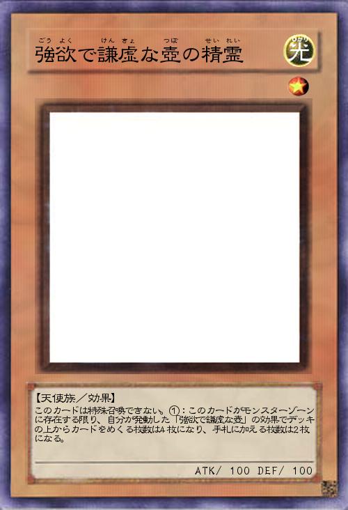 | このカードは特殊召喚できない。①:このカードがモンスターゾーンに存在する限り、自分が発動した「強欲で謙虚な壺」の効果でデッキの上からカードをめくる枚数は4枚になり、手札に加える枚数は2枚になる。 | |||
