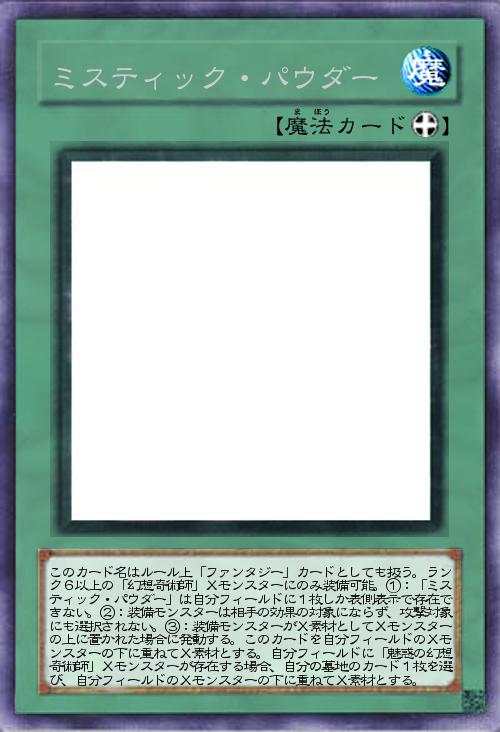 | このカード名はルール上「ファンタジー」カードとしても扱う。ランク6以上の「幻想奇術師」Xモンスターにのみ装備可能。①:「ミスティック・パウダー」は自分フィールドに1枚しか表側表示で存在できない。②:装備モンスターは相手の効果の対象にならず、攻撃対象にも選択されない。③:装備モンスターがX素材としてXモンスターの上に置かれた場合に発動する。このカードを自分フィールドのXモンスターの下に重ねてX素材とする。自分フィールドに「魅惑の幻想奇術師」Xモンスターが存在する場合、自分の墓地のカード1枚を選び、自分フィールドのXモンスターの下に重ねてX素材とする。 | |||