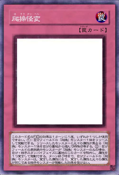 | このカード名の①②の効果は1ターンに1度、いずれか1つしか使用できない。①:自分フィールドの「爬操」モンスター1体をリリースして発動できる。リリースしたモンスターと元々の属性が異なる「爬操」モンスター1体を自分の墓地から選んで特殊召喚する。②:自分フィールドの表側表示モンスターが「爬操」モンスターのみの場合、自分・相手スタンバイフェイズに墓地のこのカードを除外し、属性を1つ宣言して発動できる。ターン終了時まで、自分フィールドの「爬操」モンスターは、宣言した属性になり、宣言した属性と元々の属性が同じである相手モンスターが発動した効果を受けない。 | |||