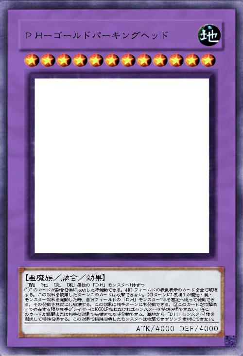 | 「闇」「地」「炎」「風」属性の「DH」モンスター1体ずつ ①このカードが融合召喚に成功した時発動できる。相手フィールドの表側表示のカードを全て破壊する。この効果を使用したターンこのカードは攻撃できない。②1ターンに1度相手が魔法・罠・モンスター効果を発動した時、自分フィールドの「DH」モンスター1体を墓地へ送って発動できる。その発動を無効にし破壊する。この効果は相手ターンにも発動できる。③このカードが攻撃表示で存在する限り相手プレイヤーは1000LP払わなければモンスターを特殊召喚できない。④このカードが戦闘または相手の効果で破壊された時発動できる。墓地から「DH」モンスター1体を選択して特殊召喚する。この効果で特殊召喚したモンスターは攻撃できずリンク素材にできない。 | |||