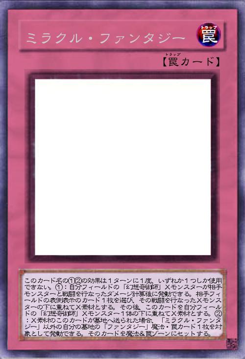 | このカード名の①②の効果は1ターンに1度、いずれか1つしか使用できない。①:自分フィールドの「幻想奇術師」Xモンスターが相手モンスターと戦闘を行なったダメージ計算後に発動できる。相手フィールドの表側表示のカード1枚を選び、その戦闘を行なったXモンスターの下に重ねてX素材とする。その後、このカードを自分フィールドの「幻想奇術師」Xモンスター1体の下に重ねてX素材とする。②:X素材のこのカードが墓地へ送られた場合、「ミラクル・ファンタジー」以外の自分の墓地の「ファンタジー」魔法・罠カード1枚を対象として発動できる。そのカードを魔法&罠ゾーンにセットする。 | |||