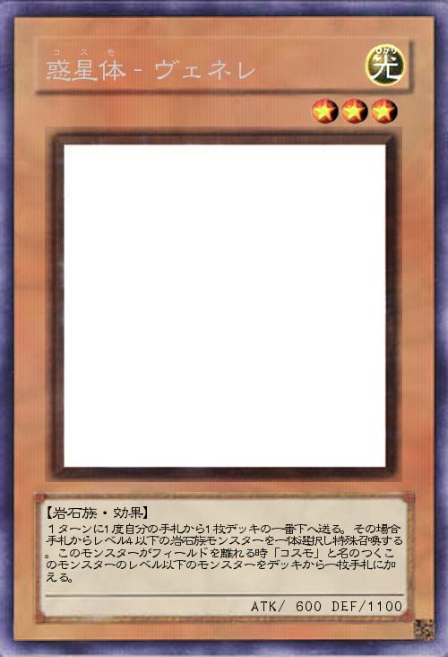 | 1ターンに1度自分の手札から1枚デッキの一番下へ送る。その場合手札からレベル4以下の岩石族モンスターを一体選択し特殊召喚する。このモンスターがフィールドを離れる時「コスモ」と名のつくこのモンスターのレベル以下のモンスターをデッキから一枚手札に加える。 | |||