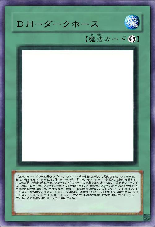 | ①自分フィールドの同じ属性の「DH」モンスター2体を墓地へ送って発動できる。デッキから、墓地へ送ったモンスターと同じ属性のレベル8の「DH」モンスター1体を選択して特殊召喚する。この効果で特殊召喚したモンスターは相手のカードの効果では破壊されない。②自分フィールドの地属性「DH」モンスター1体を選択して発動できる。対象のモンスターはターン終了時まで相手の効果の対象にならず、相手の魔法・罠カードの効果を受けない。③自分フィールドの「DH」モンスターが戦闘を行うダメージステップ開始時、墓地のこのカードを除外して発動できる。ダメージステップ終了時まで「DH」モンスターは戦闘では破壊されず、攻撃力は500ポイントアップする。この効果は相手ターンでも発動できる。 | |||