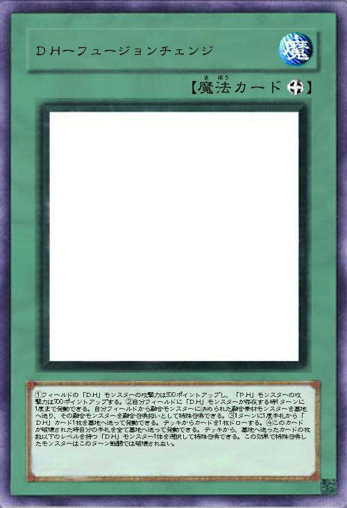 | ①フィールドの「DH」モンスターの攻撃力は500ポイントアップし、「PH」モンスターの攻撃力は700ポイントアップする。②自分フィールドに「DH」モンスターが存在する時1ターンに1度まで発動できる。自分フィールドから融合モンスターに決められた融合素材モンスターを墓地へ送り、その融合モンスターを融合召喚扱いとして特殊召喚できる。③1ターンに1度手札から「DH」カード1枚を墓地へ送って発動できる。デッキからカードを1枚ドローする。④このカードが破壊された時自分の手札を全て墓地へ送って発動できる。デッキから、墓地へ送ったカードの枚数以下のレベルを持つ「DH」モンスター1体を選択して特殊召喚できる。この効果で特殊召喚したモンスターはこのターン戦闘では破壊されない。 | |||