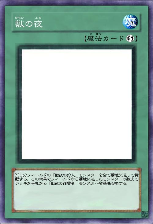 | ①自分フィールドの「獣夜の狩人」モンスターを全て墓地に送って発動する。この効果でフィールドから墓地に送ったモンスターの数までデッキか手札から「獣夜の復讐者」モンスターを特殊召喚する。 | |||