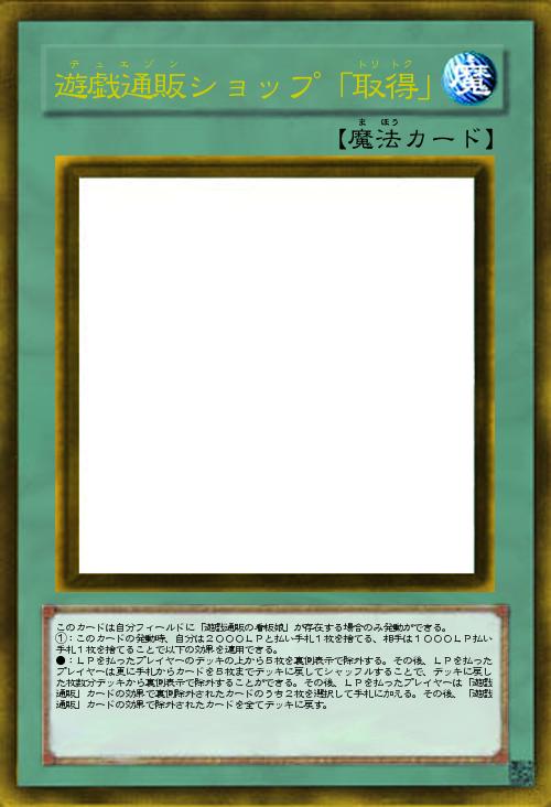 | このカードは自分フィールドに「遊戯通販の看板娘」が存在する場合のみ発動ができる。 ①:このカードの発動時、自分は2000LPと払い手札1枚を捨てる、相手は1000LP払い手札1枚を捨てることで以下の効果を適用できる。 ●:LPを払ったプレイヤーのデッキの上から5枚を裏側表示で除外する。その後、LPを払ったプレイヤーは更に手札からカードを5枚までデッキに戻してシャッフルすることで、デッキに戻した枚数分デッキから裏側表示で除外することができる。その後、LPを払ったプレイヤーは「遊戯通販」カードの効果で裏側除外されたカードのうち2枚を選択して手札に加える。その後、「遊戯通販」カードの効果で除外されたカードを全てデッキに戻す。 | |||