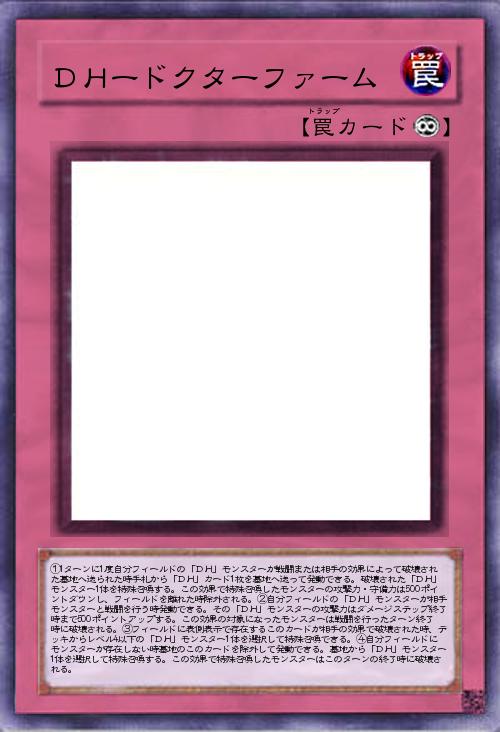 | ①1ターンに1度自分フィールドの「DH」モンスターが戦闘または相手の効果によって破壊された墓地へ送られた時手札から「DH」カード1枚を墓地へ送って発動できる。破壊された「DH」モンスター1体を特殊召喚する。この効果で特殊召喚したモンスターの攻撃力・守備力は500ポイントダウンし、フィールドを離れた時除外される。②自分フィールドの「DH」モンスターが相手モンスターと戦闘を行う時発動できる。その「DH」モンスターの攻撃力はダメージステップ終了時まで500ポイントアップする。この効果の対象になったモンスターは戦闘を行ったターン終了時に破壊される。③フィールドに表側表示で存在するこのカードが相手の効果で破壊された時、デッキからレベル4以下の「DH」モンスター1体を選択して特殊召喚できる。④自分フィールドにモンスターが存在しない時墓地のこのカードを除外して発動できる。墓地から「DH」モンスター1体を | |||
