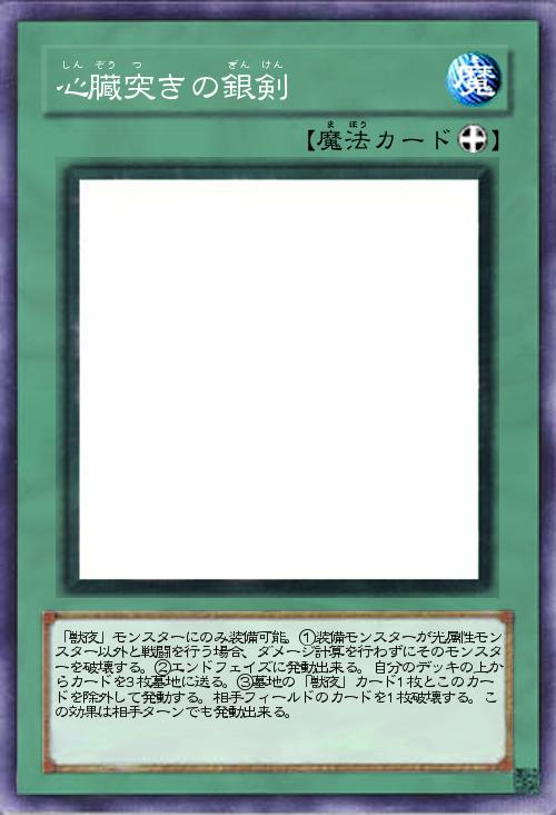 | 「獣夜」モンスターにのみ装備可能。①装備モンスターが光属性モンスター以外と戦闘を行う場合、ダメージ計算を行わずにそのモンスターを破壊する。②エンドフェイズに発動出来る。自分のデッキの上からカードを3枚墓地に送る。③墓地の「獣夜」カード1枚とこのカードを除外して発動する。相手フィールドのカードを1枚破壊する。この効果は相手ターンでも発動出来る。 | |||