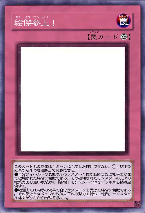 | このカード名の効果は1ターンに1度しか使用できない。①:以下の効果から1つを選択して発動できる。 ●自分フィールドの表側表示モンスター1体が戦闘または相手の効果で破壊された場合に発動できる。その破壊されたモンスターの元々の攻撃力より高い攻撃力の「絵傑」モンスター1体をデッキから特殊召喚する。 ●戦闘または相手の効果で自分がダメージを受けた場合に発動できる。その受けたダメージの数値以下の攻撃力を持つ「絵傑」モンスター1体をデッキから特殊召喚する。 | |||