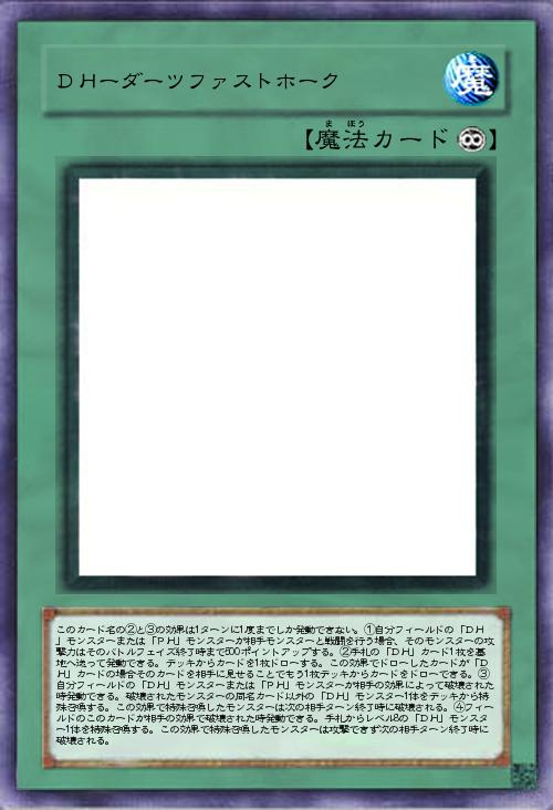 | このカード名の②と③の効果は1ターンに1度までしか発動できない。①自分フィールドの「DH」モンスターまたは「PH」モンスターが相手モンスターと戦闘を行う場合、そのモンスターの攻撃力はそのバトルフェイズ終了時まで500ポイントアップする。②手札の「DH」カード1枚を墓地へ送って発動できる。デッキからカードを1枚ドローする。この効果でドローしたカードが「DH」カードの場合そのカードを相手に見せることでもう1枚デッキからカードをドローできる。③自分フィールドの「DH」モンスターまたは「PH」モンスターが相手の効果によって破壊された時発動できる。破壊されたモンスターの同名カード以外の「DH」モンスター1体をデッキから特殊召喚する。この効果で特殊召喚したモンスターは次の相手ターン終了時に破壊される。④フィールドのこのカードが相手の効果で破壊された時発動できる。手札からレベル8の「DH」モンスター1体 | |||