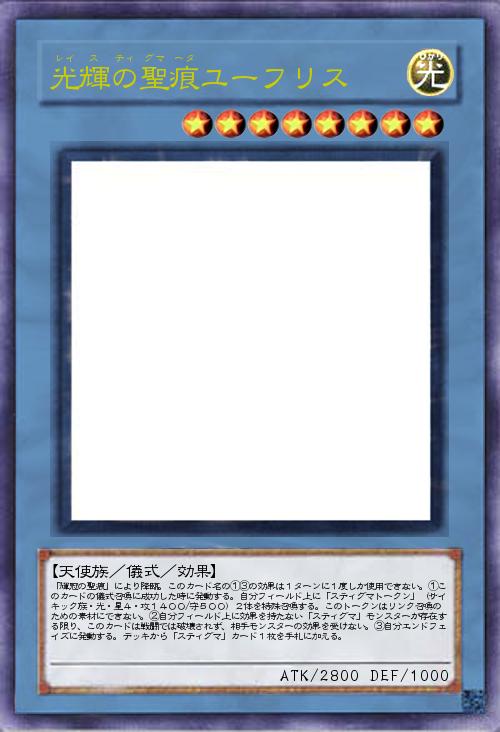 | 「輝冠の聖痕」により降臨。このカード名の①③の効果は1ターンに1度しか使用できない。①このカードの儀式召喚に成功した時に発動する。自分フィールド上に「スティグマトークン」(サイキック族・光・星4・攻1400/守500)2体を特殊召喚する。このトークンはリンク召喚のための素材にできない。②自分フィールド上に効果を持たない「スティグマ」モンスターが存在する限り、このカードは戦闘では破壊されず、相手モンスターの効果を受けない。③自分エンドフェイズに発動する。デッキから「スティグマ」カード1枚を手札に加える。 | |||