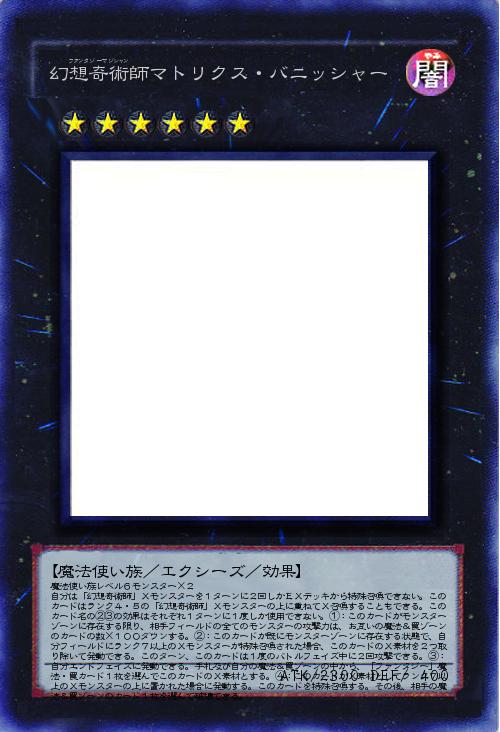| 魔法使い族レベル6モンスター×2 自分は「幻想奇術師」Xモンスターを1ターンに2回しかEXデッキから特殊召喚できない。このカードはランク4・5の「幻想奇術師」Xモンスターの上に重ねてX召喚することもできる。このカード名の②③の効果はそれぞれ1ターンに1度しか使用できない。①:このカードがモンスターゾーンに存在する限り、相手フィールドの全てのモンスターの攻撃力は、お互いの魔法&罠ゾーンのカードの数×100ダウンする。②:このカードが既にモンスターゾーンに存在する状態で、自分フィールドにランク7以上のXモンスターが特殊召喚された場合、このカードのX素材を2つ取り除いて発動できる。このターン、このカードは1度のバトルフェイズ中に2回攻撃できる。③:自分エンドフェイズに発動できる。手札及び自分の魔法&罠ゾーンの中から「ファンタジー」魔法・罠カード1枚を選んでこのカードのX素材とする。④:このカード | |||