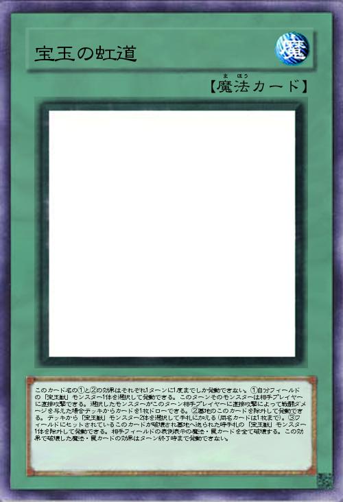 | このカード名の①と②の効果はそれぞれ1ターンに1度までしか発動できない。①自分フィールドの「宝玉獣」モンスター1体を選択して発動できる。このターンそのモンスターは相手プレイヤーに直接攻撃できる。選択したモンスターがこのターン相手プレイヤーに直接攻撃によって戦闘ダメージを与えた場合デッキからカードを1枚ドローできる。②墓地のこのカードを除外して発動できる。デッキから「宝玉獣」モンスター2体を選択して手札に加える(同名カードは1枚まで)。③フィールドにセットされているこのカードが破壊され墓地へ送られた時手札の「宝玉獣」モンスター1体を除外して発動できる。相手フィールドの表側表示の魔法・罠カードを全て破壊する。この効果で破壊した魔法・罠カードの効果はターン終了時まで発動できない。 | |||