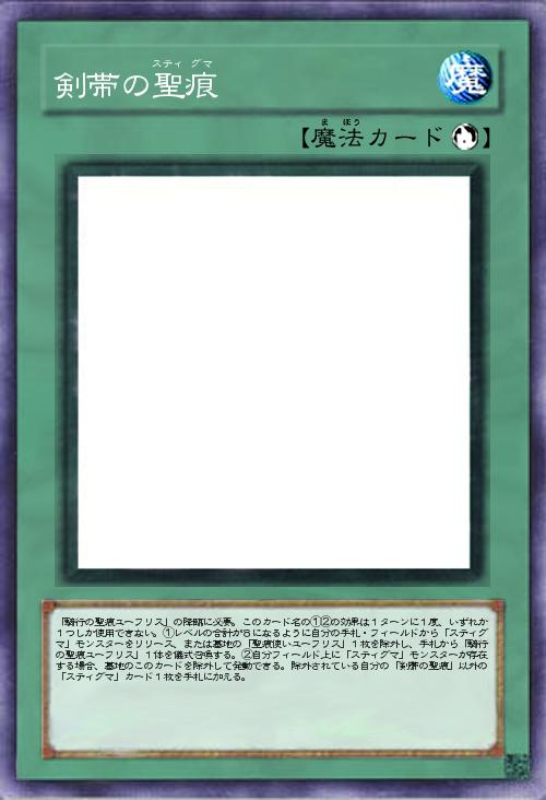 | 「騎行の聖痕ユーフリス」の降臨に必要。このカード名の①②の効果は1ターンに1度、いずれか1つしか使用できない。①レベルの合計が8になるように自分の手札・フィールドから「スティグマ」モンスターをリリース、または墓地の「聖痕使いユーフリス」1枚を除外し、手札から「騎行の聖痕ユーフリス」1体を儀式召喚する。②自分フィールド上に「スティグマ」モンスターが存在する場合、墓地のこのカードを除外して発動できる。除外されている自分の「剣帯の聖痕」以外の「スティグマ」カード1枚を手札に加える。 | |||