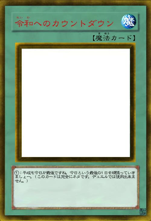 | ①:平成も今日が最後ですね。今日という最後の1日を頑張っていきましょー。(このカードは完全にネタです。デュエルでは使用出来ません。) | |||