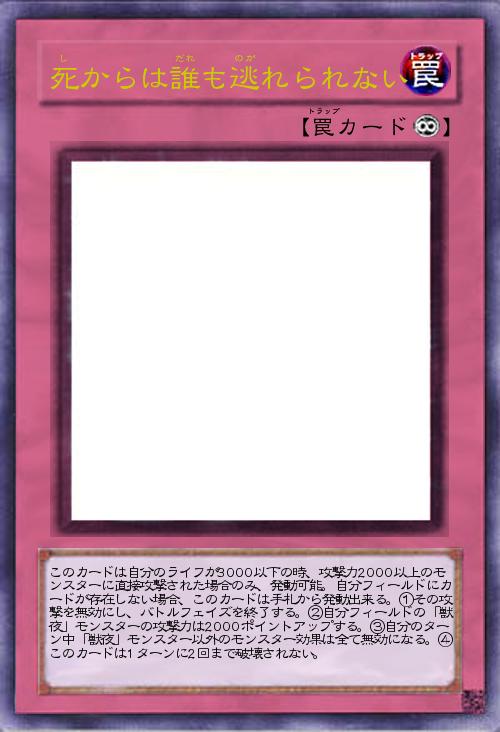 | このカードは自分のライフが3000以下の時、攻撃力2000以上のモンスターに直接攻撃された場合のみ、発動可能。自分フィールドにカードが存在しない場合、このカードは手札から発動出来る。①その攻撃を無効にし、バトルフェイズを終了する。②自分フィールドの「獣夜」モンスターの攻撃力は2000ポイントアップする。③自分のターン中「獣夜」モンスター以外のモンスター効果は全て無効になる。④このカードは1ターンに2回まで破壊されない。 | |||