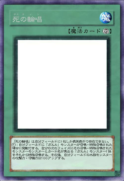 | 「死の輪唱」は自分フィールドに1枚しか表側表示で存在できない。①:自分フィールドに「ガエル」モンスターが召喚・特殊召喚された場合に発動できる。自分の次のフェイズにその召喚・特殊召喚されたモンスターモンスターとカード名が異なる「ガエル」モンスター1体を手札から特殊召喚する。その後、自分フィールドの水族モンスターの攻撃力・守備力は100アップする。 | |||
