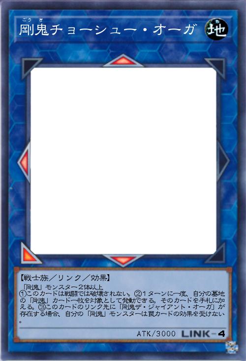 | 「剛鬼」モンスター2体以上 ①このカードは戦闘では破壊されない。②1ターンに一度、自分の墓地の「剛鬼」カード一枚を対象として発動できる。そのカードを手札に加える。③このカードのリンク先に「剛鬼ザ・ジャイアント・オーガ」が存在する場合、自分の「剛鬼」モンスターは罠カードの効果を受けない。 | |||