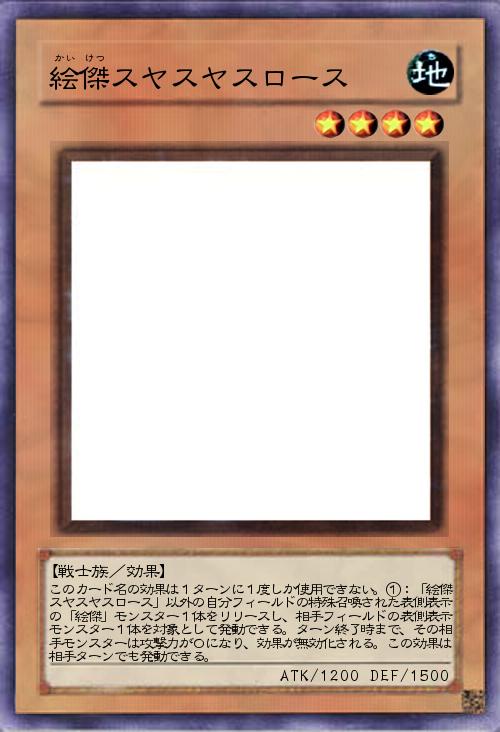 | このカード名の効果は1ターンに1度しか使用できない。①:「絵傑スヤスヤスロース」以外の自分フィールドの特殊召喚された表側表示の「絵傑」モンスター1体をリリースし、相手フィールドの表側表示モンスター1体を対象として発動できる。ターン終了時まで、その相手モンスターは攻撃力が0になり、効果が無効化される。この効果は相手ターンでも発動できる。 | |||