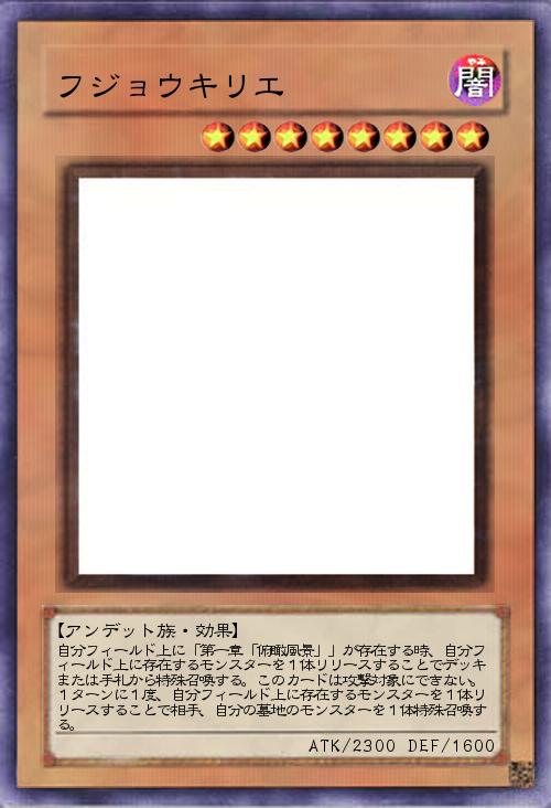 | 自分フィールド上に「第一章「俯瞰風景」」が存在する時、自分フィールド上に存在するモンスターを1体リリースすることでデッキまたは手札から特殊召喚する。このカードは攻撃対象にできない。1ターンに1度、自分フィールド上に存在するモンスターを1体リリースすることで相手、自分の墓地のモンスターを1体特殊召喚する。 | |||