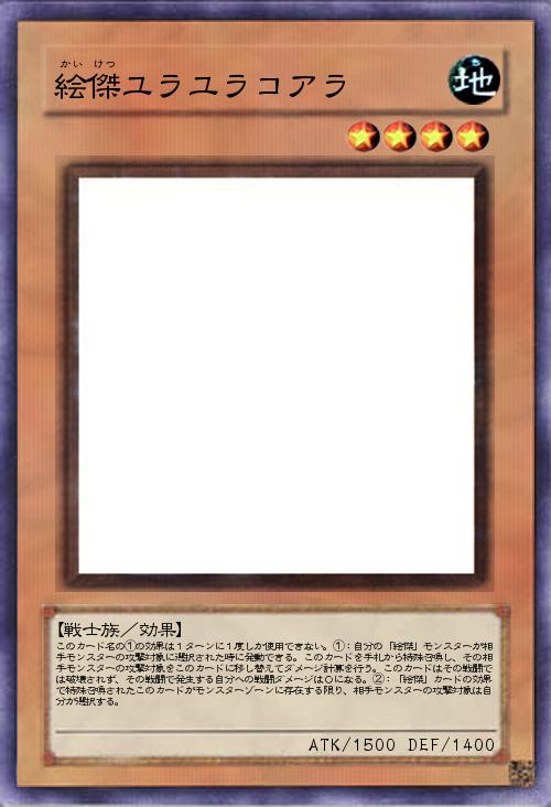 | このカード名の①の効果は1ターンに1度しか使用できない。①:自分の「絵傑」モンスターが相手モンスターの攻撃対象に選択された時に発動できる。このカードを手札から特殊召喚し、その相手モンスターの攻撃対象をこのカードに移し替えてダメージ計算を行う。このカードはその戦闘では破壊されず、その戦闘で発生する自分への戦闘ダメージは0になる。②:「絵傑」カードの効果で特殊召喚されたこのカードがモンスターゾーンに存在する限り、相手モンスターの攻撃対象は自分が選択する。 | |||