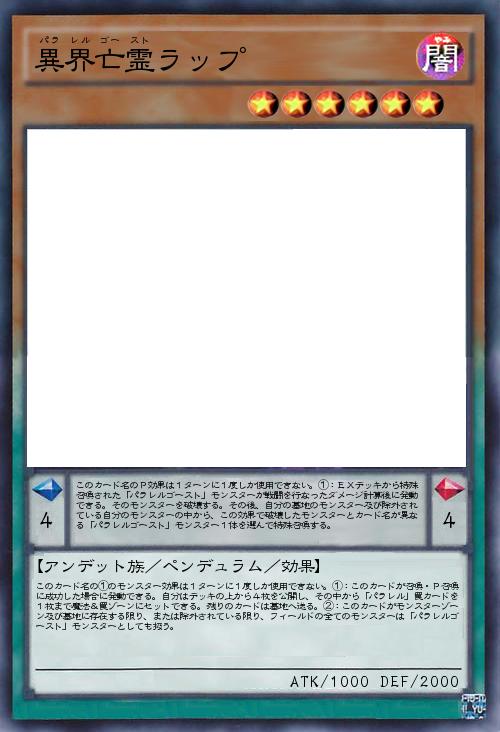 | このカード名のP効果は1ターンに1度しか使用できない。①:EXデッキから特殊召喚された「パラレルゴースト」モンスターが戦闘を行なったダメージ計算後に発動できる。そのモンスターを破壊する。その後、自分の墓地のモンスター及び除外されている自分のモンスターの中から、この効果で破壊したモンスターとカード名が異なる「パラレルゴースト」モンスター1体を選んで特殊召喚する。 | |||