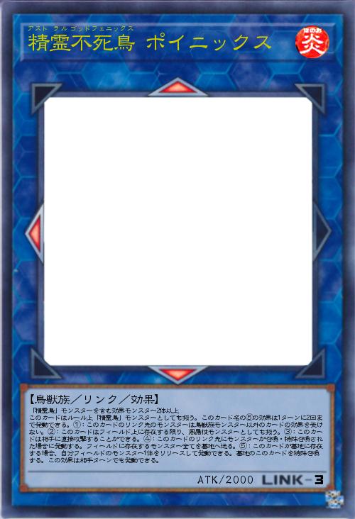 | 「精霊鳥」モンスターを含む効果モンスター2体以上 このカードはルール上「精霊鳥」モンスターとしても扱う。このカード名の⑤の効果は1ターンに2回まで発動できる。①:このカードのリンク先のモンスターは鳥獣族モンスター以外のカードの効果を受けない。②:このカードはフィールド上に存在する限り、風属性モンスターとしても扱う。③:このカードは相手に直接攻撃することができる。④:このカードのリンク先にモンスターが召喚・特殊召喚された場合に発動する。フィールドに存在するモンスター全てを墓地へ送る。⑤:このカードが墓地に存在する場合、自分フィールドのモンスター1体をリリースして発動できる。墓地のこのカードを特殊召喚する。この効果は相手ターンでも発動できる。 | |||