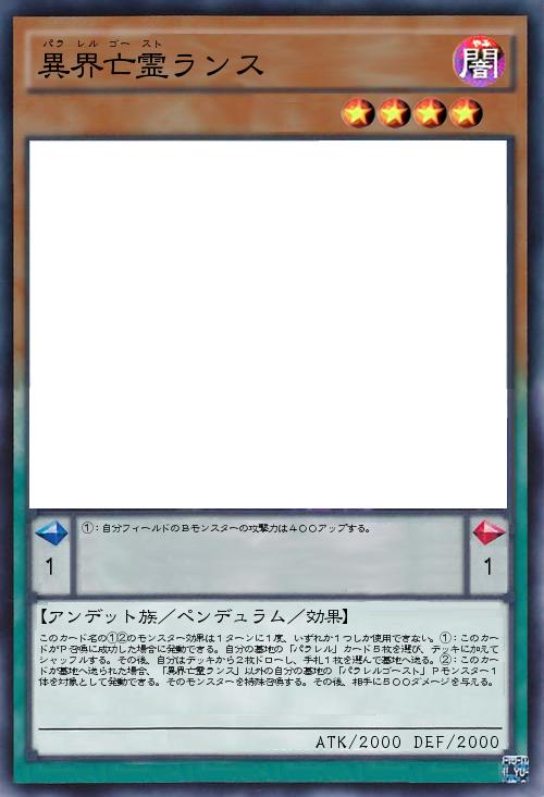 | このカード名の①②のモンスター効果は1ターンに1度、いずれか1つしか使用できない。①:このカードがP召喚に成功した場合に発動できる。自分の墓地の「パラレル」カード5枚を選び、デッキに加えてシャッフルする。その後、自分はデッキから2枚ドローし、手札1枚を選んで墓地へ送る。②:このカードが墓地へ送られた場合、「異界亡霊ランス」以外の自分の墓地の「パラレルゴースト」Pモンスター1体を対象として発動できる。そのモンスターを特殊召喚する。その後、相手に500ダメージを与える。 | |||