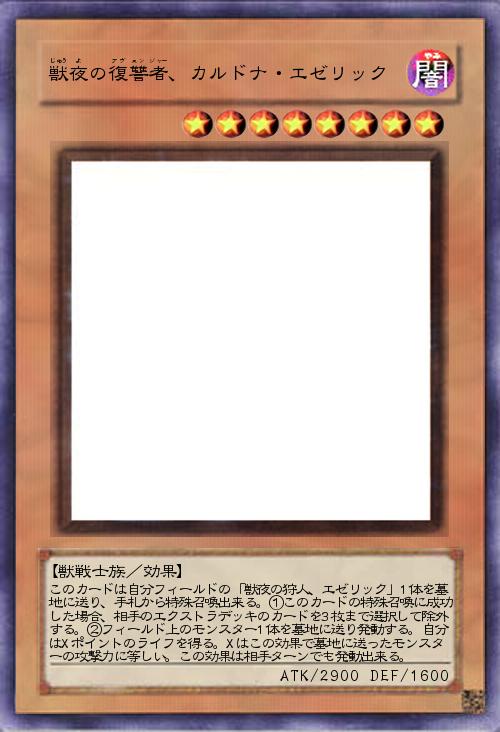| このカードは自分フィールドの「獣夜の狩人、エゼリック」1体を墓地に送り、手札から特殊召喚出来る。①このカードの特殊召喚に成功した場合、相手のエクストラデッキのカードを3枚まで選択して除外する。②フィールド上のモンスター1体を墓地に送り発動する。自分はXポイントのライフを得る。Xはこの効果で墓地に送ったモンスターの攻撃力に等しい。この効果は相手ターンでも発動出来る。 | |||