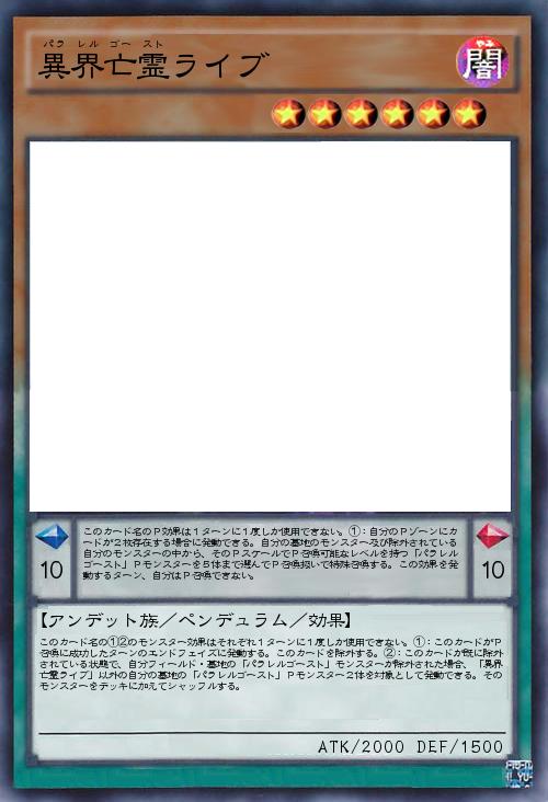 | このカード名の①②のモンスター効果はそれぞれ1ターンに1度しか使用できない。①:このカードがP召喚に成功したターンのエンドフェイズに発動する。このカードを除外する。②:このカードが既に除外されている状態で、自分フィールド・墓地の「パラレルゴースト」モンスターが除外された場合、「異界亡霊ライブ」以外の自分の墓地の「パラレルゴースト」Pモンスター2体を対象として発動できる。そのモンスターをデッキに加えてシャッフルする。 | |||