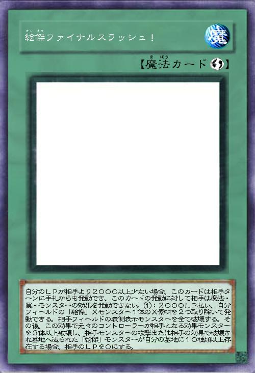 | 自分のLPが相手より2000以上少ない場合、このカードは相手ターンに手札からも発動でき、このカードの発動に対して相手は魔法・罠・モンスターの効果を発動できない。①:2000LP払い、自分フィールドの「絵傑」Xモンスター1体のX素材を2つ取り除いて発動できる。相手フィールドの表側表示モンスターを全て破壊する。その後、この効果で元々のコントローラーが相手となる効果モンスターを3体以上破壊し、相手モンスターの攻撃または相手の効果で破壊され墓地へ送られた「絵傑」モンスターが自分の墓地に10種類以上存在する場合、相手のLPを0にする。 | |||