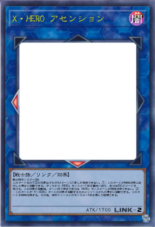 | 戦士族モンスター2体 このカード名の①②の効果はそれぞれ1ターンに1度しか使用できない。①:このカードが特殊召喚に成功した場合に発動できる。デッキから「HERO」モンスター1体を墓地へ送り、自分は500ダメージを受ける。この効果の発動後、ターン終了時まで自分は「HERO」モンスターしか特殊召喚できない。②:このカードが「V・HERO」カードの効果を発動するためにリリースされた場合に発動できる。このカードを特殊召喚する。その後、相手フィールドのモンスター1体を選んで破壊できる。 | |||