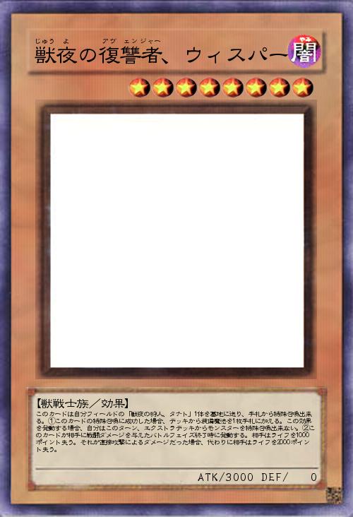 | このカードは自分フィールドの「獣夜の狩人、タナト」1体を墓地に送り、手札から特殊召喚出来る。①このカードの特殊召喚に成功した場合、デッキから装備魔法を1枚手札に加える。この効果を発動する場合、自分はこのターン、エクストラデッキからモンスターを特殊召喚出来ない。②このカードが相手に戦闘ダメージを与えたバトルフェイズ終了時に発動する。相手はライフを1000ポイント失う。それが直接攻撃によるダメージだった場合、代わりに相手はライフを2000ポイント失う。 | |||