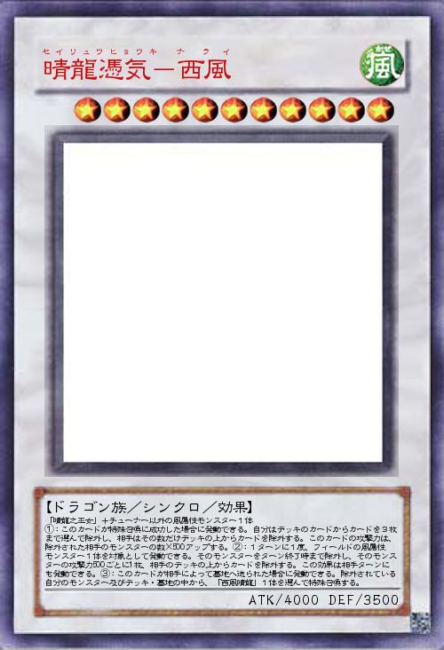 | 「晴龍之巫女」+チューナー以外の風属性モンスター1体 ①:このカードが特殊召喚に成功した場合に発動できる。自分はデッキのカードからカードを3枚まで選んで除外し、相手はその数だけデッキの上からカードを除外する。このカードの攻撃力は、除外された相手のモンスターの数×500アップする。②:1ターンに1度、フィールドの風属性モンスター1体を対象として発動できる。そのモンスターをターン終了時まで除外し、そのモンスターの攻撃力500ごとに1枚、相手のデッキの上からカードを除外する。この効果は相手ターンにも発動できる。③:このカードが相手によって墓地へ送られた場合に発動できる。除外されている自分のモンスター及びデッキ・墓地の中から、「西風晴龍」1体を選んで特殊召喚する。 | |||