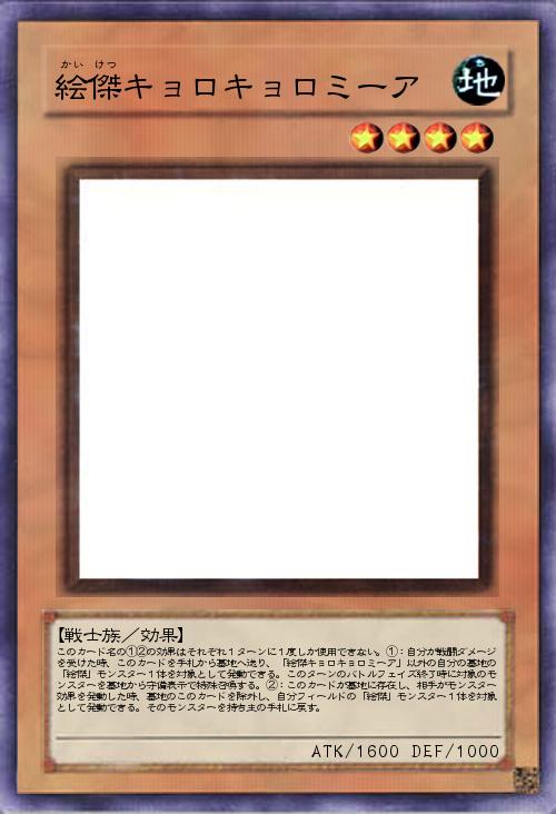 | このカード名の①②の効果はそれぞれ1ターンに1度しか使用できない。①:自分が戦闘ダメージを受けた時、このカードを手札から墓地へ送り、「絵傑キョロキョロミーア」以外の自分の墓地の「絵傑」モンスター1体を対象として発動できる。このターンのバトルフェイズ終了時に対象のモンスターを墓地から守備表示で特殊召喚する。②:このカードが墓地に存在し、相手がモンスター効果を発動した時、墓地のこのカードを除外し、自分フィールドの「絵傑」モンスター1体を対象として発動できる。そのモンスターを持ち主の手札に戻す。 | |||
